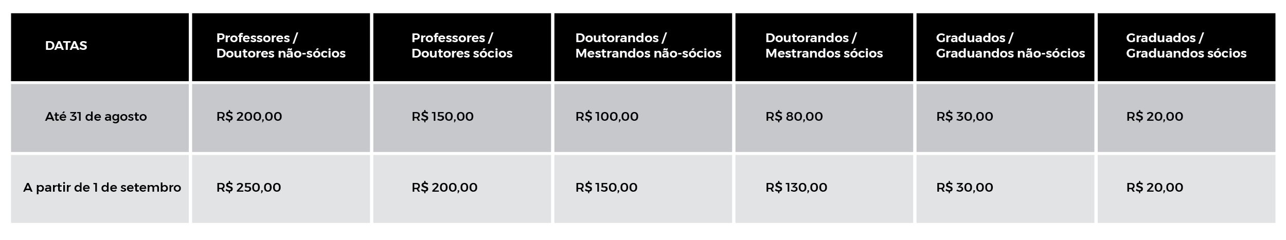 As inscrições no evento estarão condicionadas ao pagamento da Taxa de Inscrição. Para os sócios da SHB, além do pagamento da Taxa de Inscrição, é necessário quitar a(s) taxa(s) de anuidade junto à Secretaria de Finanças, desde 2020, incluindo 2023. Para esta especificidade, ver orientações no site da SHB. Apenas os participantes não residentes no Brasil podem pagar sua taxa de inscrição no evento, na hora do credenciamento.